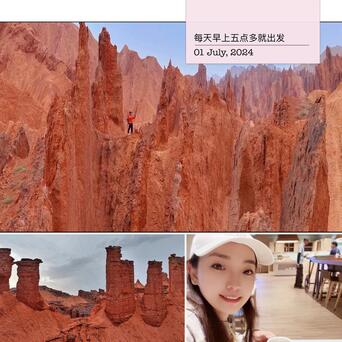 小微到新疆旅行已经3天了,今天要离开库车出发下一站,在库车的酒店连住了3天,今天第一次吃到酒店的早餐,因为每天早上五点多就出发,开车走颠簸路一小时才能到拍摄地,中午一点左右又回到城里吃午饭休息,晚上七点又集合出发拍摄晚霞到十一点左右回城里,白天睡不着又想出门逛古城,真想每天多一点时间。以下照片都是视频和手机截图,今晚会熬夜剪视频争取明天发!感谢大家的支持陪伴。